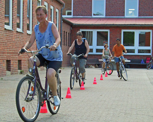 An einem ruhigen Ort lernen Sie das Radfahren Schritt für Schritt, in Ihrem Tempo, in einer kleinen Gruppe.