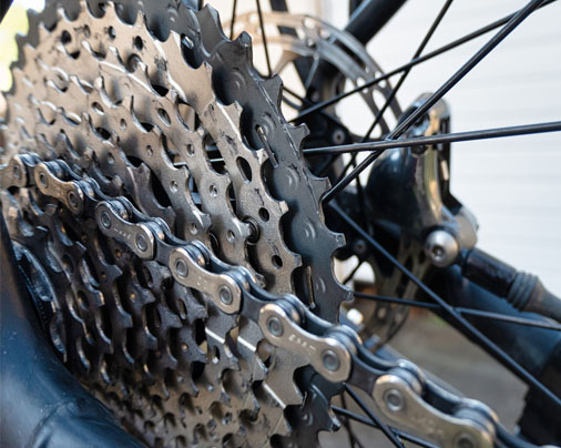 Wer sein Fahrrad viel benutzt sollte es auch in regelmäßigen Abständen pflegen. Bewegliche Teile müssen geschmiert werden und das Rad sollte sauber gehalten werden damit frühzeitiger Verschleiß vermieden werden kann. Die meiste Pflege benötigt die Kette sowie die Kasette, da diese den Umwelteinflüssen am stärksten augesetzt sind. Für die Reinigung der Kette, nimmt man ein trockenes Tuch, durch welches man die Kette laufen lässt, bis keine Schmiere mehr auf dem Tuch zurückbleibt. Dann sollte man die Kasette ebenfalls von Kettenöl und Schmutz befreien. Dies tut man am besten mit einer Bürste. Hier kann auch Entfetter eingesetzt werden. Letztendlich kann wieder sparsam Öl auf die Kette aufgetragen werden. Sobald die Kette beim Pedalieren zu hören ist, sollte der Vorgang wiederholt werden.